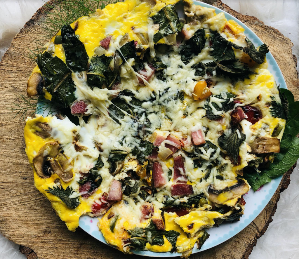 Dandelion and nettle grow in abundance in my garden and all over Ireland. If you are using them please pick from an unsprayed area and always only pick what you need. Use gloves for the nettle and cut the leaves from the stems. Add all of this to your pan. You can cut your dandelion leaves into smaller pieces. When your veg is ready, add your egg mixture, allow to cook for a few mins and then place under the grill to set the top. Add cheese or whatever toppings you enjoy, and your meal is ready. By adding wild herbs to your meal you are giving you body the extra added Vitamins and minerals the body needs.