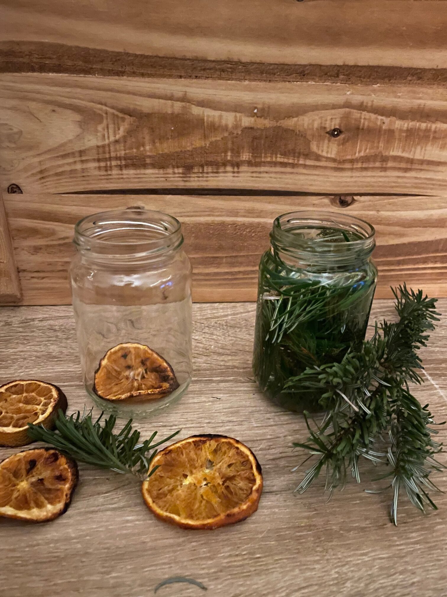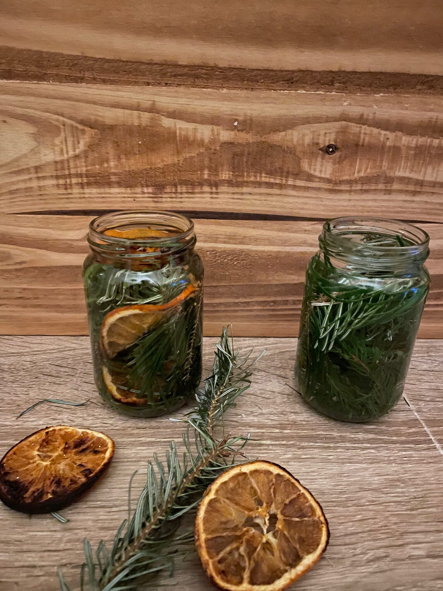 Place your pine/oranges or mixture of both into your jar, half fill if dried and fill if fresh.