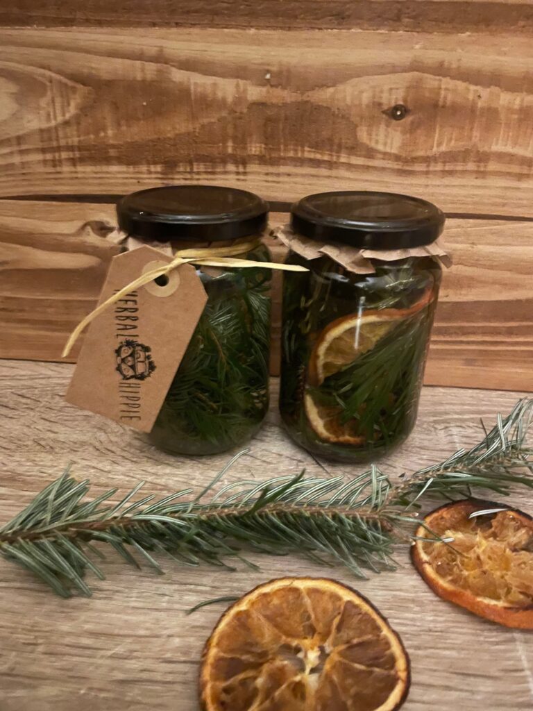 after the three three weeks get yourself a clean jar, some cheese cloth/muslin and stain out the liquid, you will see the liquid has changed colours as it is now infused with amazing herbal benefits. please place the pine/oranges in your compost of back into the earth.